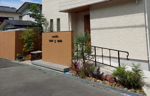温かみのある茶色の塗り壁に、植栽の緑とアイアン調の手すりを組み合わせました。日々の使い勝手はもちろん、経年変化を楽しめる素材選びと、飽きのこないモダンなデザインをご提案します。