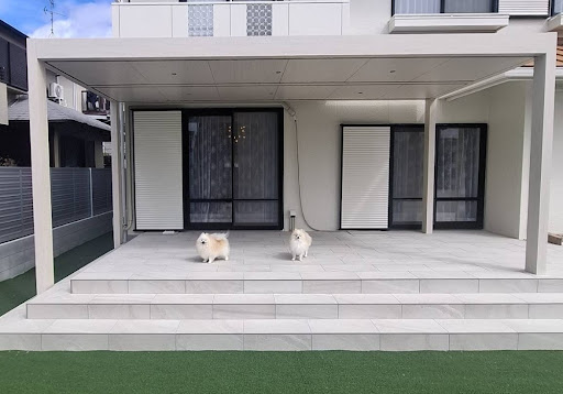 タカショー「ホームヤードルーフ」と、愛犬が走り回れるタイルテラス